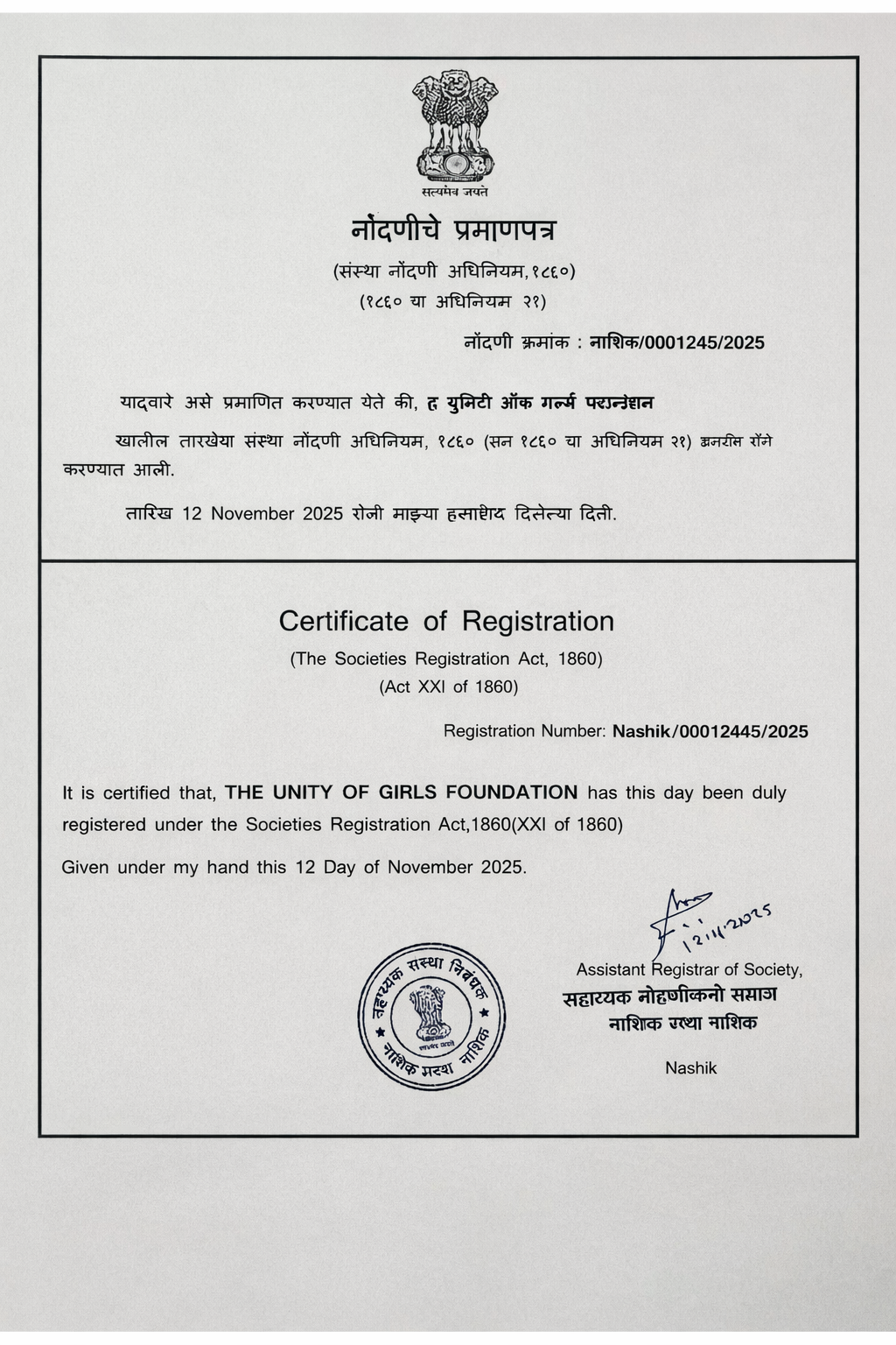 The Unity Of Girls Foundation – Registeration Certificate